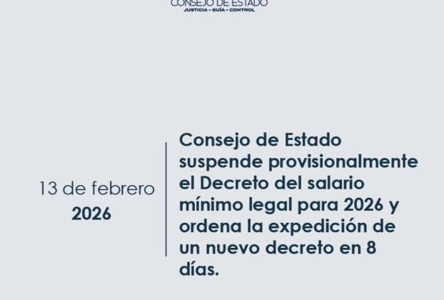 El Consejo de Estado decretó la suspensión provisional de los efectos del Decreto 1469 del 29 de diciembre de 2025 expedido por el Gobierno Nacional, mediante el cual se fijó el salario mínimo legal para el año 2026 en $1.750.905. Se trata de una medida provisional que no implica un pronunciamiento definitivo sobre la legalidad […]
