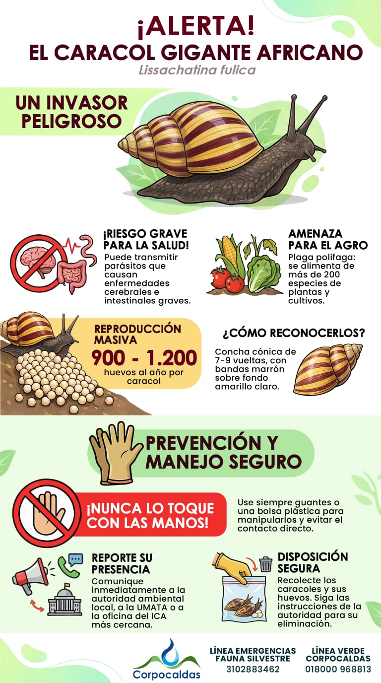 Desde Corpocaldas se hace un llamado a la comunidad para estar atentos a la presencia del caracol gigante africano, una especie invasora que representa un grave riesgo para la salud, el ambiente y la producción agrícola.