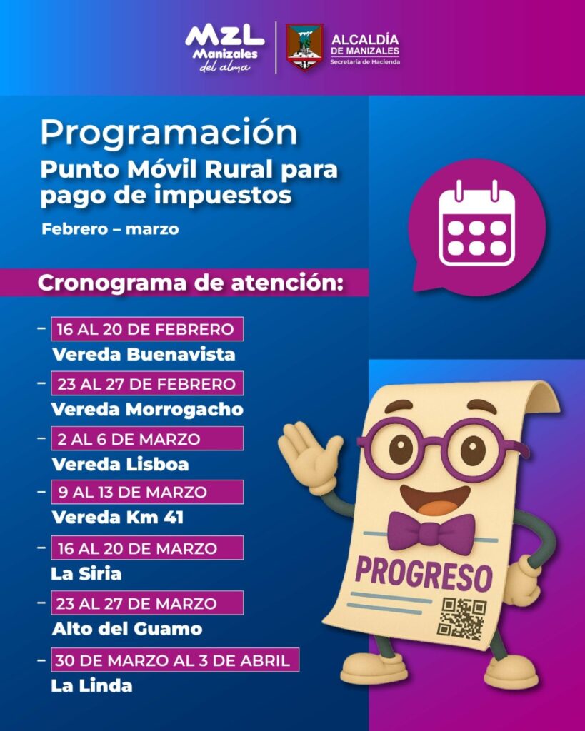 Con el objetivo de facilitar el cumplimiento de las obligaciones tributarias en la zona rural, la Secretaría de Hacienda de Manizales implementa el Punto Móvil Rural en siete sectores del municipio entre el lunes 16 de febrero y el viernes 3 de abril de 2026. La estrategia permitire que los contribuyentes realicen sus pagos sin necesidad de desplazarse hasta el casco urbano.
