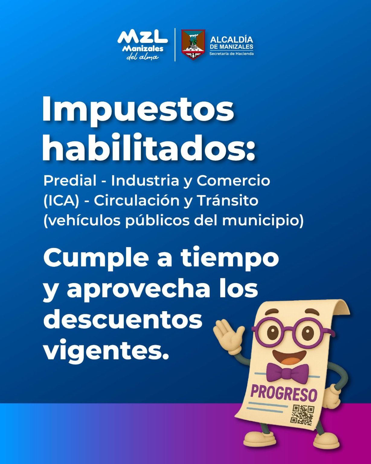 - Los contribuyentes podrán pagar Predial, Industria y Comercio (ICA) y Circulación y Tránsito, accediendo a descuentos vigentes por pronto pago y alivio en intereses de mora por tiempo limitado.