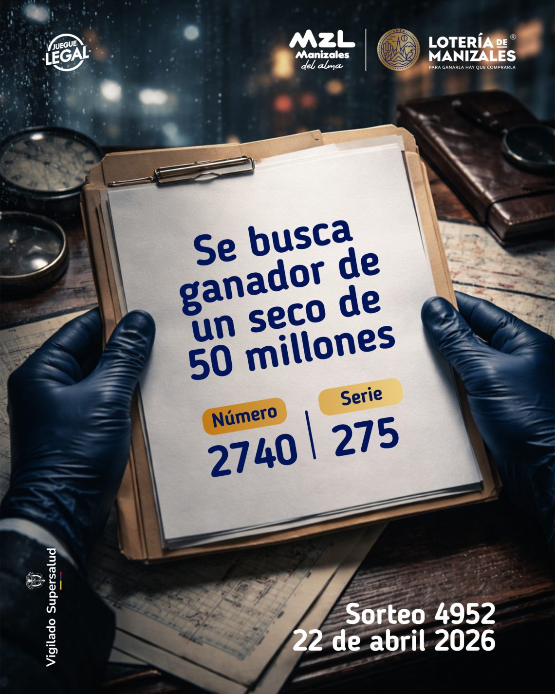 En el plan de premios de la Lotería de Manizales se proyectan 50 premios secos que van desde $40 millones a $300 millones, de los cuales cayó uno de $50 millones en el sorteo 4952 y aún no se ha reclamado. El número ganador fue: 2740 (serie 275).